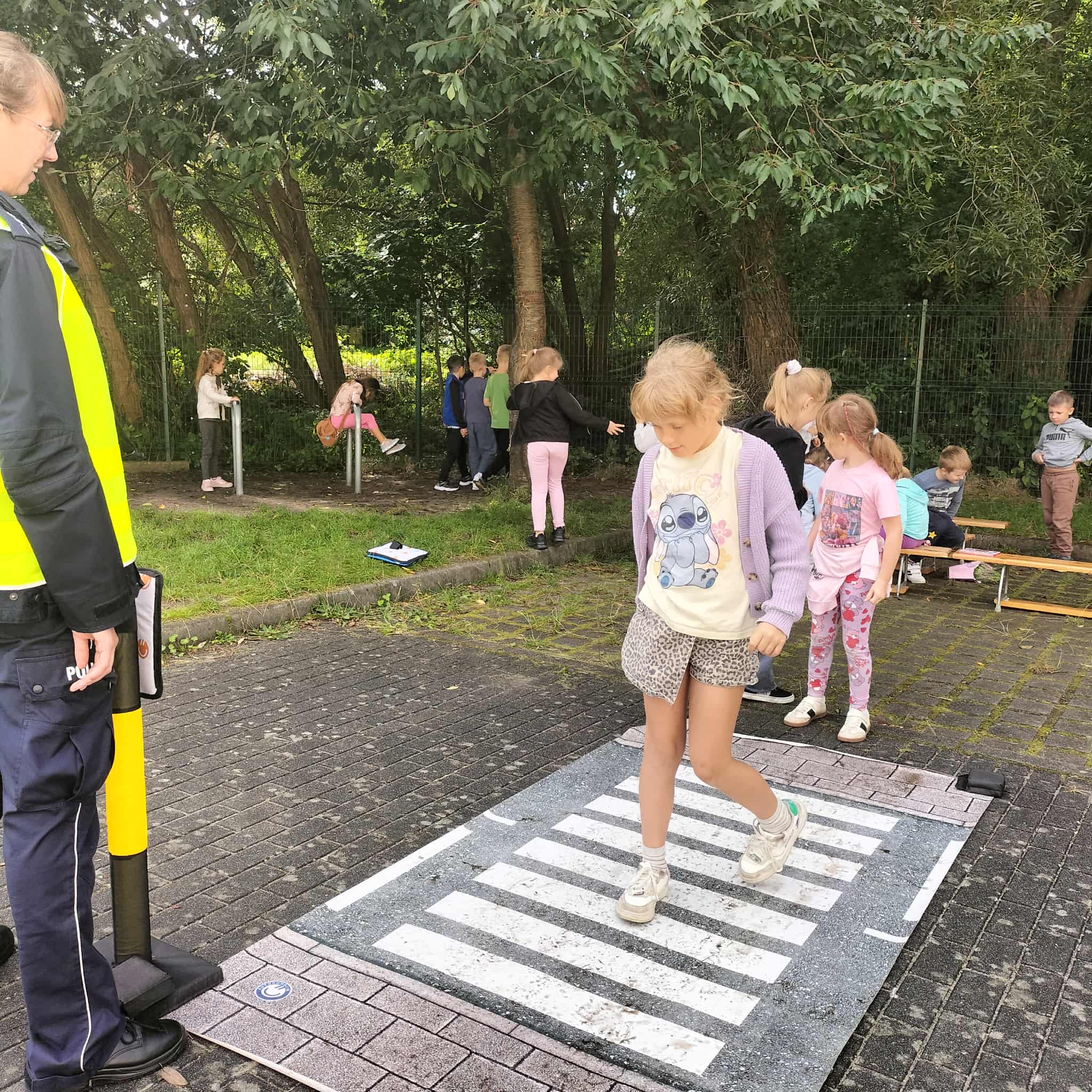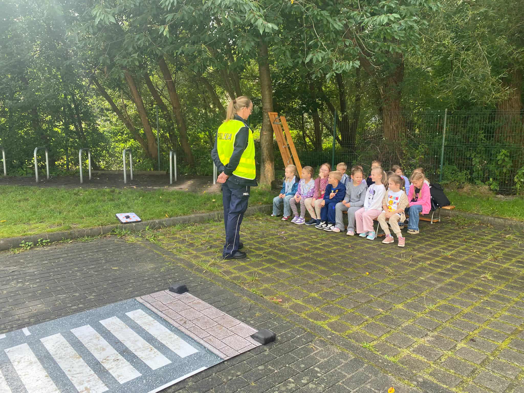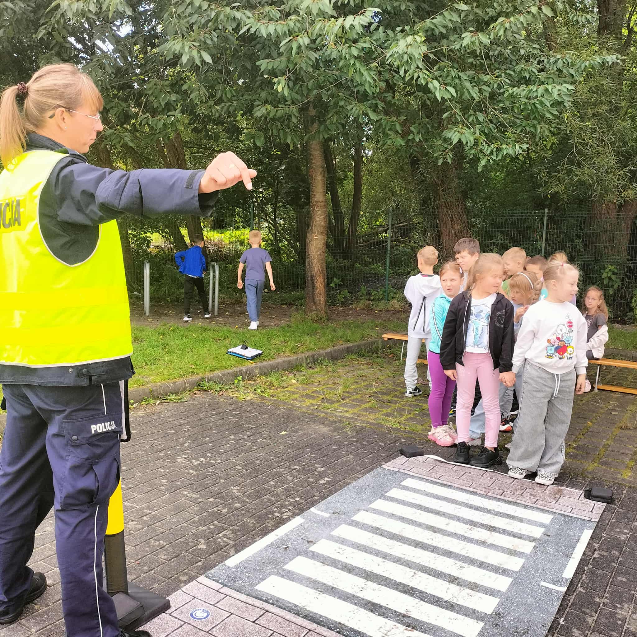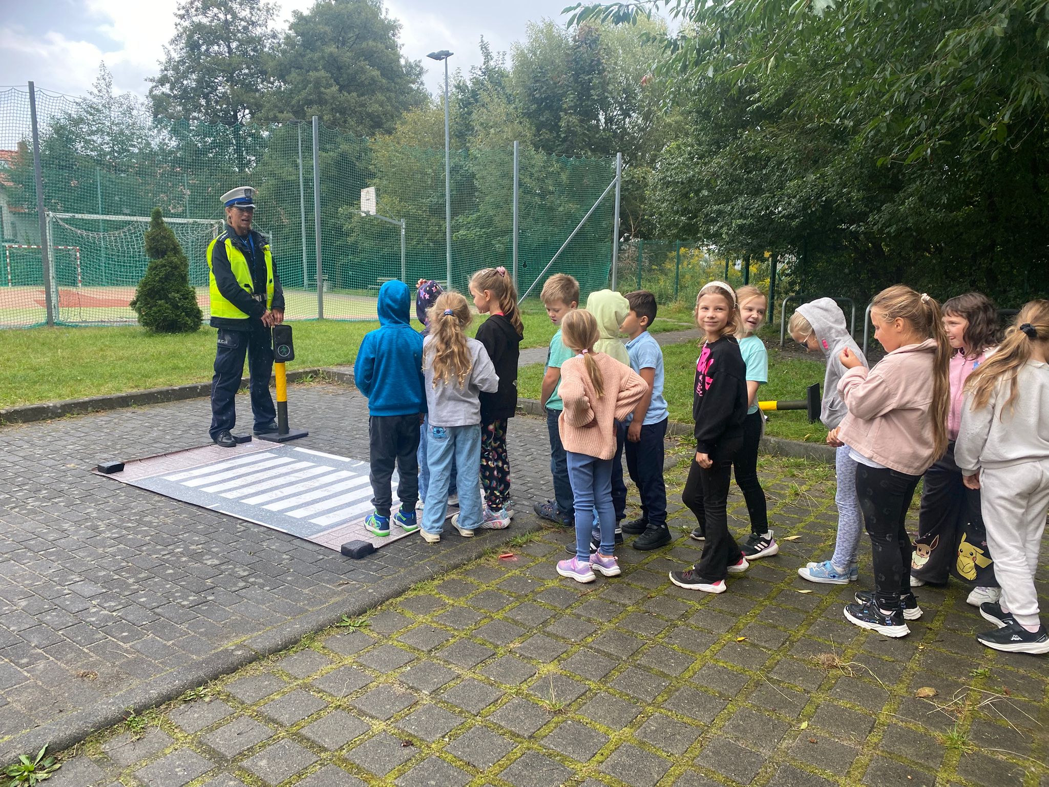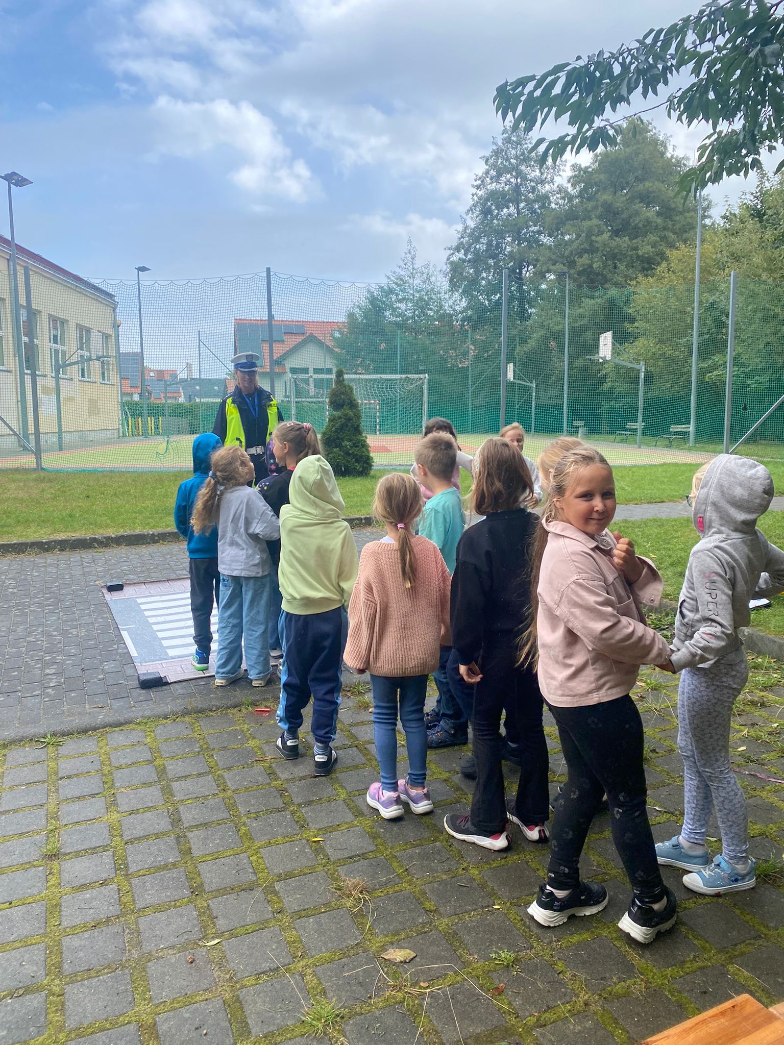 W dn.15.09.br. klasy pierwsze wzięły udział w spotkaniu z policjantką z Wydziału Ruchu Drogowego. Uczyły się jak przestrzegać zasad poruszania się w ruchu drogowym oraz jak bezpiecznie przechodzić przez przejście dla pieszych. Z zaangażowaniem ćwiczyły również tę umiejętność. Była to bardzo pożyteczna lekcja, którą na długo zapamiętają.